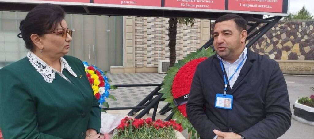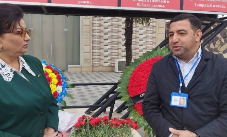 Sonda Bərdə terror qurbanlarının xatirəsinə salınmış kompleksin önündə şəkil çəkdirilib.