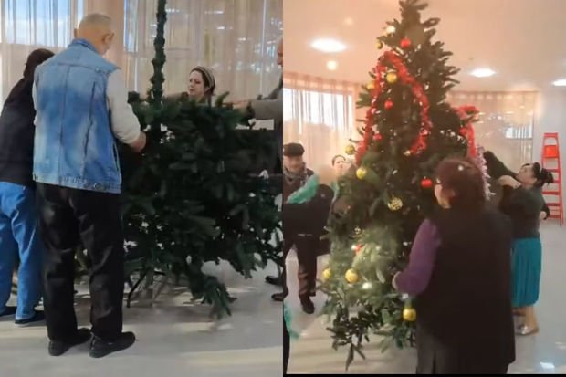 Görüntülərdə sakinlərin şam ağacını bəzəməsi əks olunub.
