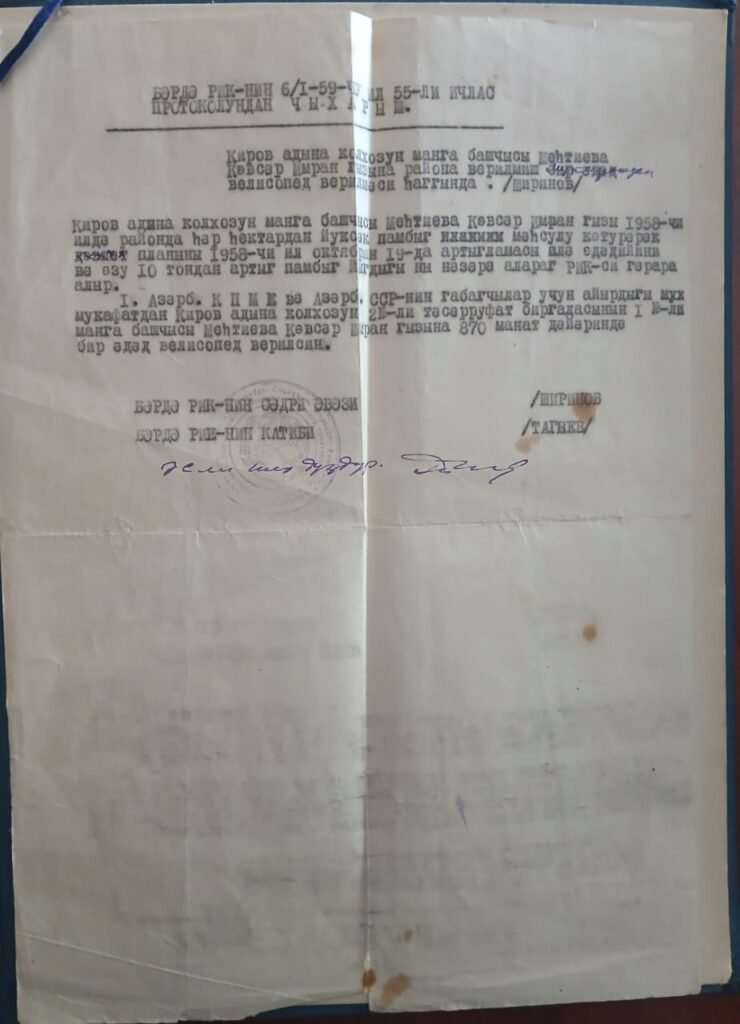 Partiya və hökumət onun məhsuldar əməyini irili- xırdalı hədiyyələrlə və eləcədə“Moskviç-407” markalı maşınla mükafatlandırmışdır.
