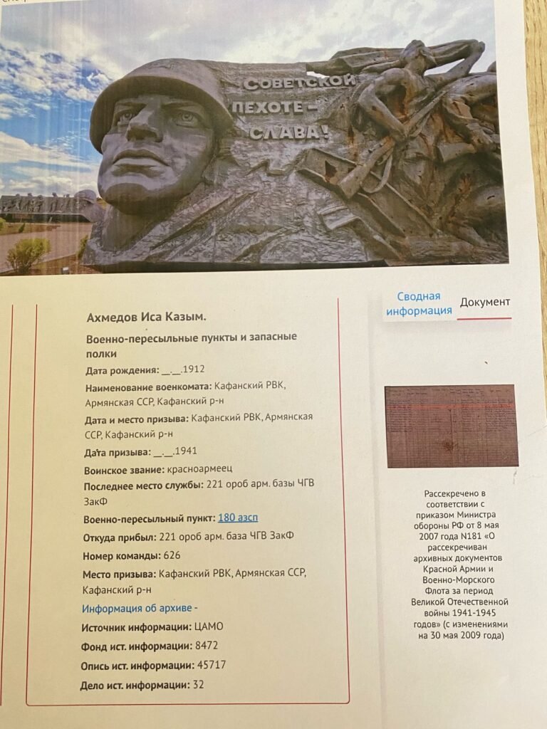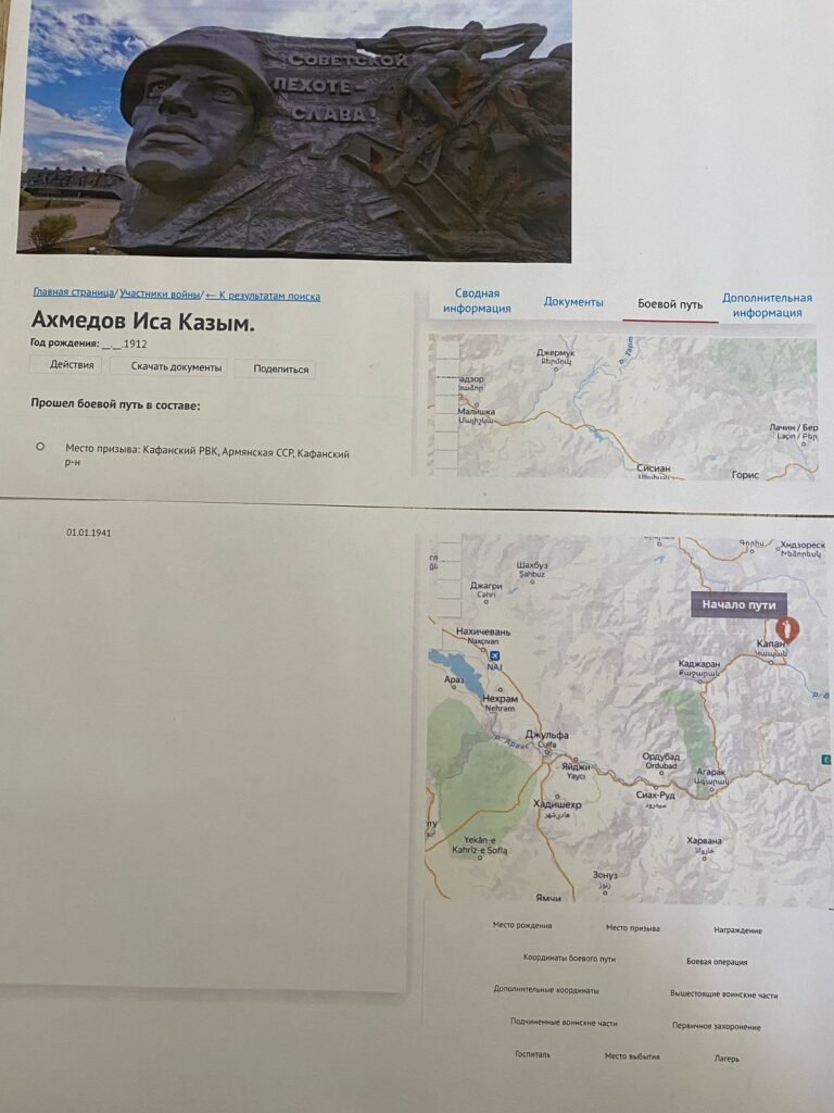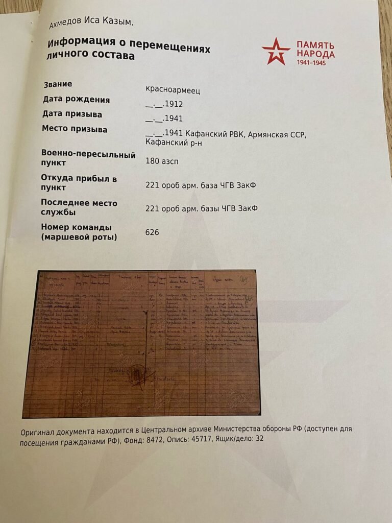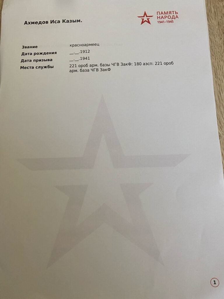1939-cu il sentyabrın 1-də Faşist Almaniyası ildırımsürətli “Barbarossa” planı əsasında Polşanı işğal edib. Bununla da bəşəriyyət tarixinə ən qanlı müharibə kimi daxil olan İkinci Dünya müharibəsi başlayıb. 1941-ci il iyunun 22-də isə Hitler Almaniyası Azərbaycanın da daxil olduğu SSRİ-yə hücum edib. Mən Əhmədova Sevinc Akif qızı Böyük Vətən Müharibəsinin 80 (səksən) illiyik Qələbə yubileyi münasibətilə, Babam Əhmədov İsa Kazım oğlunun döyüş yolu haqqında məlumat çatdırmaq istəyirəm. Babam Əhmədov İsa Kazım oğlu 1912-ci ildə Qərbi Azərbaycan Zəngəzur mahalı Qafan rayonunda anadan olmuşdir. 1941-ci ildə İkinci Dünya Müharibəsi başlanması ilə əlaqədar Qafan r-nu üzrə keçmiş (Кафанский РВК, Армянская ССР, Кафанский р-н) Hərbi komisarlığı tərəfindən müharibəyə çağırılmışdır. Babam Əhmədov İsa Kazım oğlu Böyük Vətən Müharibəsi zamanı 4 (dörd) il 3 (üç) ay müddətinə Sevastopil ,Stalinqrad (indiki Volqaqrad) şəhərlərinin alınmasında qəhrəmancasına döyüşmüş, Qızıl ordu (Красноармеец) əsgəri adına laiq görülmüş Suvorov Kutuzov orderi və bir çox medallarla tərtiv olunmuşdur. Babab müharibənin bitməyinə bir neçə ay qalmış Kerç boğazında vuruşarkən ağır yaralanmış qospitalda müəyyən müddətə müalıcə almış və yaralanmasının dərəcədini nəzərə alaraq CCP Dövləti tərəfindən (221 ороб арм.базы ЧГВ Закф) demobilizavat olunmuşdur. Cox sevindirici və qürürlanacaq bir hisdir ki babam Əhmədov İsa Kazım oğlunun İkinci Dünya Müharibəsi işrtakçısı olması barədə bütün sənədli məlumatları hal-hazırda Rusya Federassiyasının Mərkəzi Milli Arxiv İdarəsi və Dövlət tərəfindən yaradılmış elektron www.pamyat-naroda.ru portalında qorunub saxlanıqmaqdadır (Оригинал документа находится в Централном архиве Министерства обороны РФ) Başda atam və öz adımdan deyə bilərəm ki, babamız mənim və bütün evladlarının nəvələrinin nəticələrinin yaddaşında adıyla insanlığı ilə zəhməkeş mehriban qayğıkeş ailə başçılığlı ilə yanaşı qəhrəmanlığı ilə də hər zanman qəbilizdə yaşayacaq və daim qürürla anılacaqdır.Təssüflə babam gənc yaşında dünyasını dəyişdir. Mənim nənəmdən atamdan eşitdiyim xatirələrimdə babmın qısa yaşadığı ömründə həmişə sevgiylə hörmətlə anıldığı onun nə qədər vətəninə elinə obasına ailəsinə doğmalırana qarşı hörmətli sədaqətli qayğıkeş mərd fəxr edəcək bir insan olduğu deyilmişdir.Böyük Vətən Müharibəsinin 80(səksən)illik qələbə yübileyi münasibətilə sağ qalan müharibə iştrakçılarını təbrik edir, dünyadan köçənlərə Allahdan rəhmət diləyirik.Əziz qəhrəman İsa babamız biz səni daim fəxr və qürürla hörmətlə anırıq, səninlə hər zaman fəxr edirik.Allah sizə rəhmət etsin məkanınız cənnət olsun.