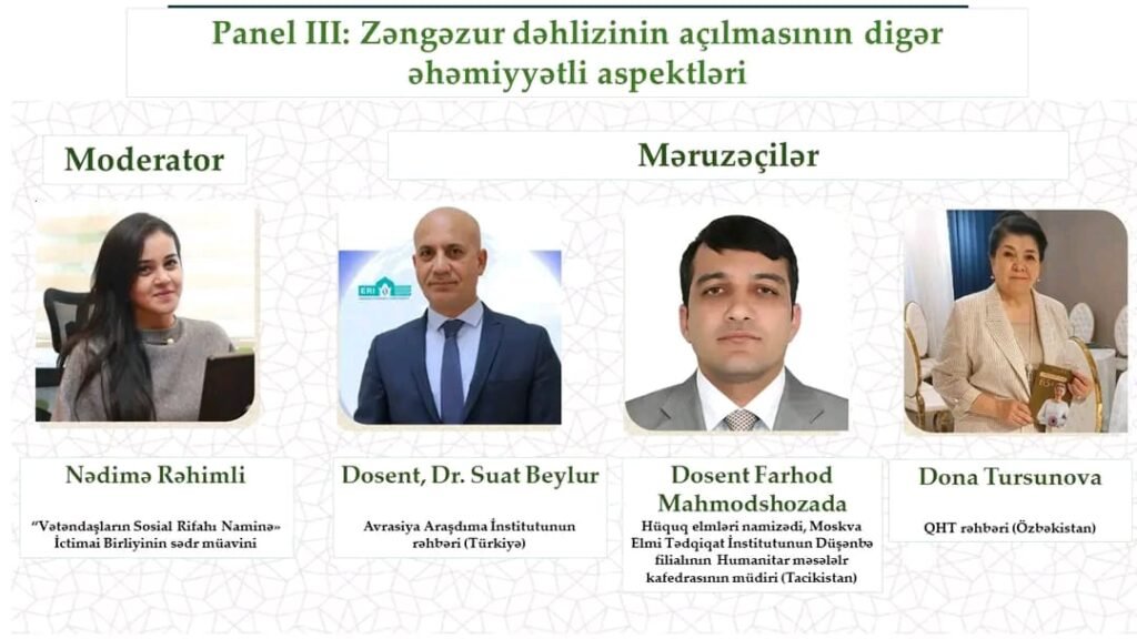 Belə ki, “Vətəndaşların Sosial Rifahı Naminə” İB-nin sədr müavini Nədimə Rəhimlinin moderatorluğu ilə keçən paneldə ilk panelçi Avrasiya Araşdırma İnstitutunun rəhbəri Suat Beylur – Zəngəzur dəhlizinin Türk Dövlətləri Təşkilatı ölkələrində kultural bütövlüyə təsir imkanları və gələcək perspektivlərdən danışdı. Hüquq elmləri namizədi, Moskva Elmi Tədqiqat İnstitutunun Düşənbə filialının Humanitar məsələlər kafedrasının müdiri Farhod Mahmodshozada beynəlxalq nəqliyyat dəhlizlərinin fəaliyyətinə hüquqi dəstəyin aspektlərindən, sonuncu panelçi Özbəkistandan QHT sədri Dona Tursunova isə dəhlizin açılmasına vətəndaş cəmiyyətinin münasibətindən və dəstəyindən geniş söz açdı.