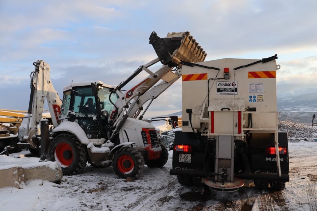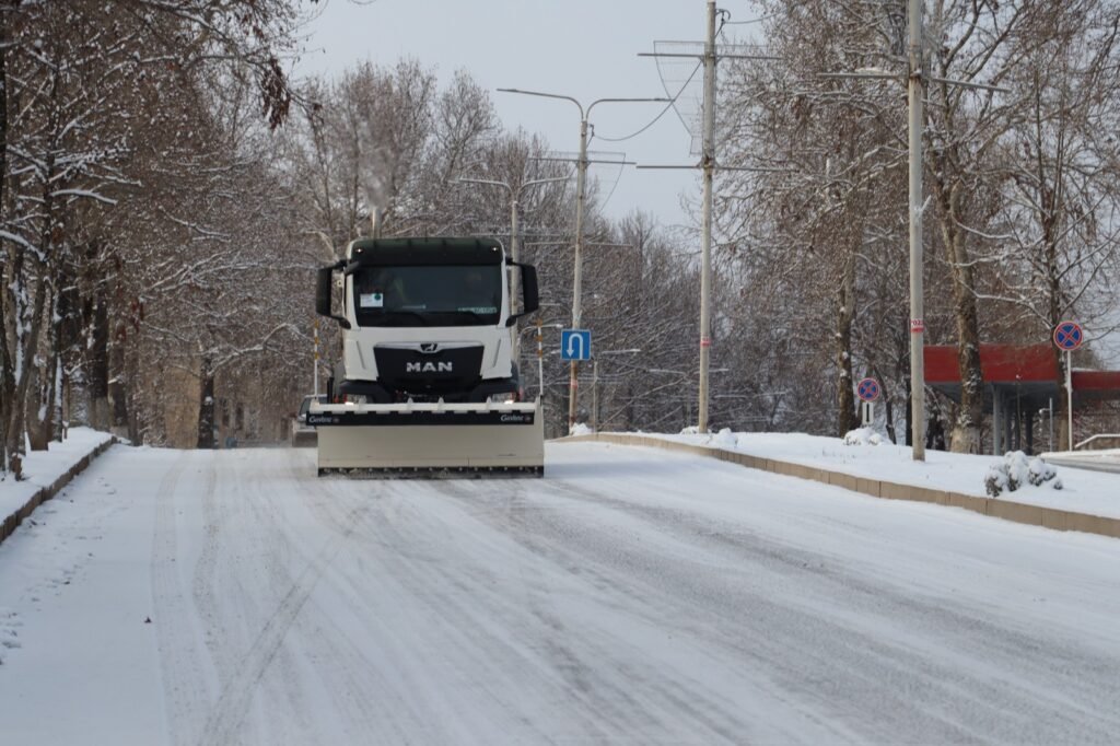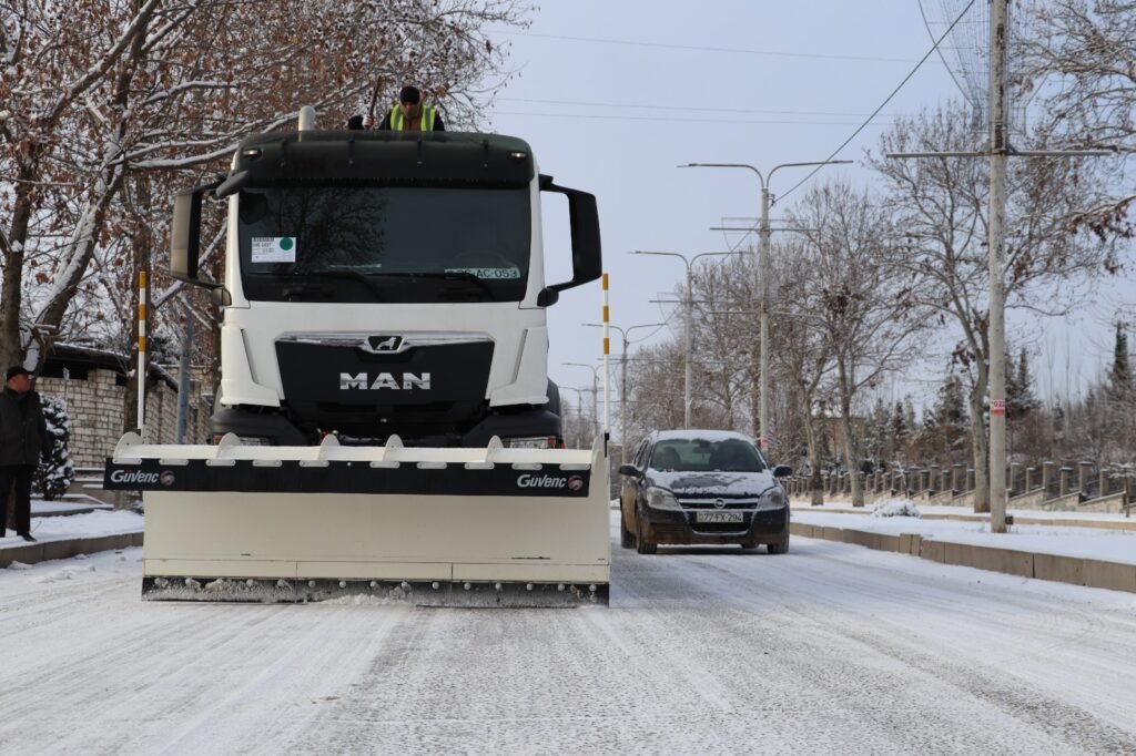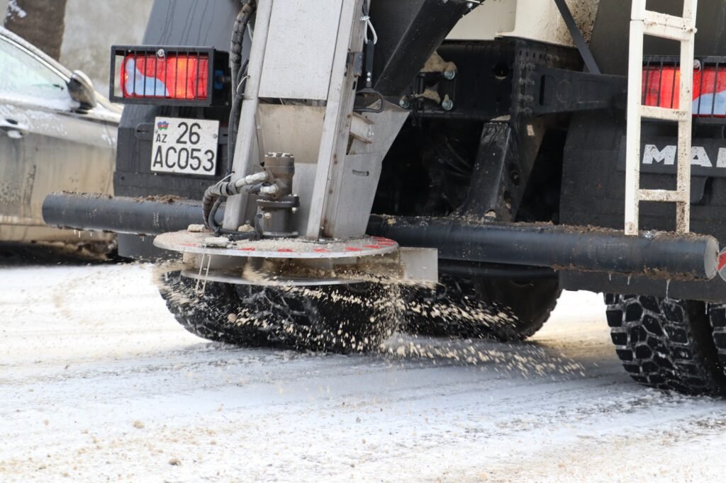 Şəhərin küçələri qardan təmizlənir. Yollara duz və qum səpilir.
